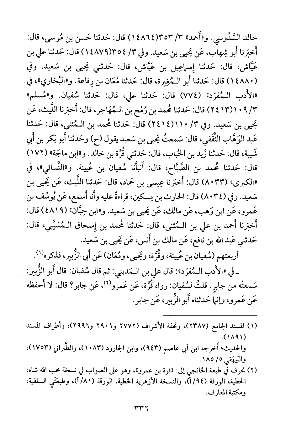 وفي (٨٠٣٤) قال: الحارث بن مسكين، قراءة عليه وأنا أسمع، عن يوسف بن عَمرو، عن ابن وهب، عن مالك، عن يحيى بن سعيد. و «ابن حِبَّان» (٤٨١٩) قال: أخبرنا أحمد بن علي بن المثنى، قال: حدثنا محمد بن إسحاق المُسَيبي، قال: حدثني عبد الله بن نافع، عن مالك بن أنس، عن يحيى بن سعيد.