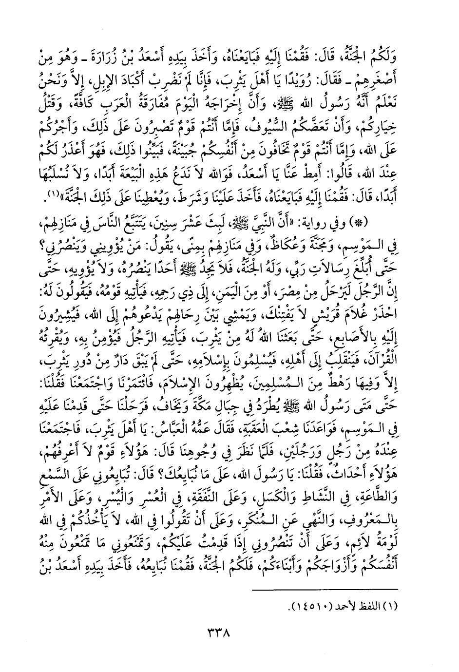 - وفي رواية: «أن النبي صَلى الله عَليه وسَلم لبث عشر سنين، يتتبع الناس في منازلهم، في الموسم، ومَجنَّة وعكاظ، وفي منازلهم، يقول: من يؤويني وينصرني؟ حتى أبلغ رسالات ربي، وله الجنة، فلا يجد صَلى الله عَليه وسَلم أحدا ينصره، ولا يؤويه، حتى إن الرجل ليرحل من مصر، أو من اليمن، إلى ذي رحمه، فيأتيه قومه، فيقولون له: احذر غلام قريش لا يفتنك، ويمشي بين رحالهم يدعوهم إلى الله، فيشيرون إليه بالأصابع، حتى بعثنا الله له من يثرب، فيأتيه الرجل فيؤمن به، ويقرئه القرآن، فينقلب إلى أهله، فيسلمون بإسلامه، حتى لم يبق دار من دور يثرب، إلا وفيها رهط من المسلمين، يظهرون الإسلام، فائتمرنا واجتمعنا فقلنا: حتى متى رسول الله صَلى الله عَليه وسَلم يطرد في جبال مكة ويخاف، فرحلنا حتى قدمنا عليه في الموسم، فواعدنا شعب العقبة، فقال عمه العباس: يا أهل يثرب، فاجتمعنا عنده من رجل ورجلين، فلما نظر في وجوهنا قال: هؤلاء قوم لا أعرفهم، هؤلاء أحداث، فقلنا: يا رسول الله، على ما نبايعك؟ قال: تبايعوني على السمع والطاعة، في النشاط والكسل، وعلى النفقة، في العسر واليسر، وعلى الأمر بالمعروف، والنهي عن المنكر، وعلى أن تقولوا في الله، لا يأخذكم في الله لومة لائم، وعلى أن تنصروني إذا قدمت عليكم، وتمنعوني ما تمنعون منه أنفسكم وأزواجكم وأبناءكم، فلكم الجنة، فقمنا نبايعه، فأخذ بيده أسعد بن