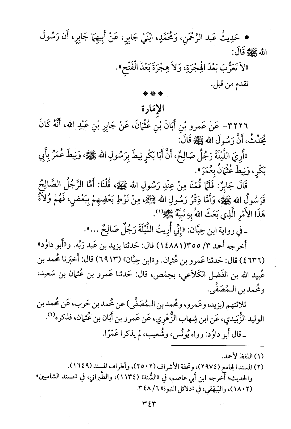 ٣٢٢٦ - عن عَمرو بن أَبَان بن عثمان، عن جابر بن عبد الله، أنه كان يحدث، أن رسول الله صَلى الله عَليه وسَلم قال: