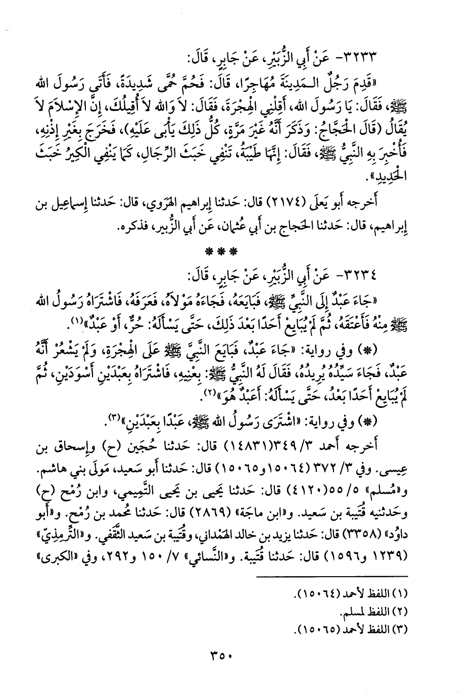 - وفي رواية: «جاء عبد، فبايع النبي صَلى الله عَليه وسَلم على الهجرة، ولم يشعر أنه عبد، فجاء سيده يريده، فقال له النبي صَلى الله عَليه وسَلم: بعنيه، فاشتراه بعبدين أسودين، ثم لم يبايع أحدا بعد، حتى يسأله: أعبد هو» (¬٢).