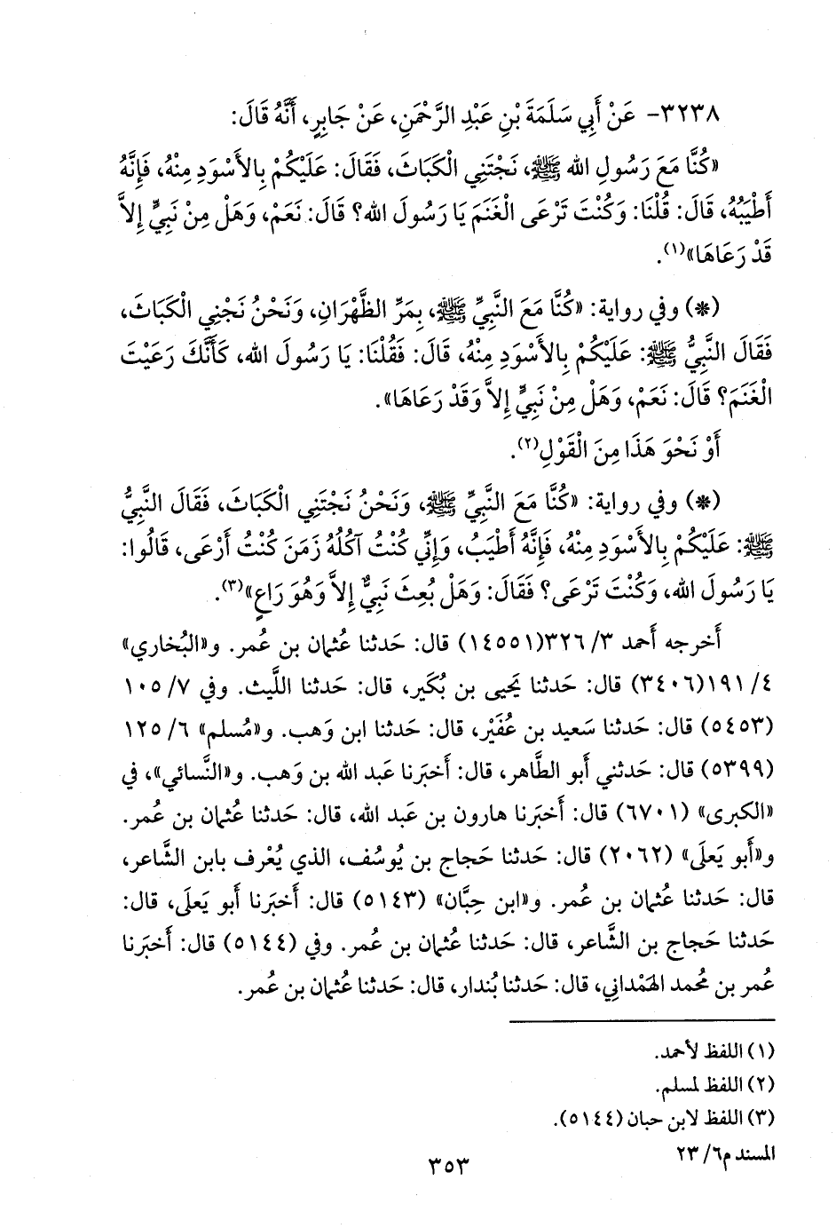 - وفي رواية: «كنا مع النبي صَلى الله عَليه وسَلم بمر الظهران، ونحن نجني الكباث، فقال النبي صَلى الله عَليه وسَلم: عليكم بالأسود منه، قال: فقلنا: يا رسول الله، كأنك رعيت الغنم؟ قال: نعم، وهل من نبي إلا وقد رعاها».