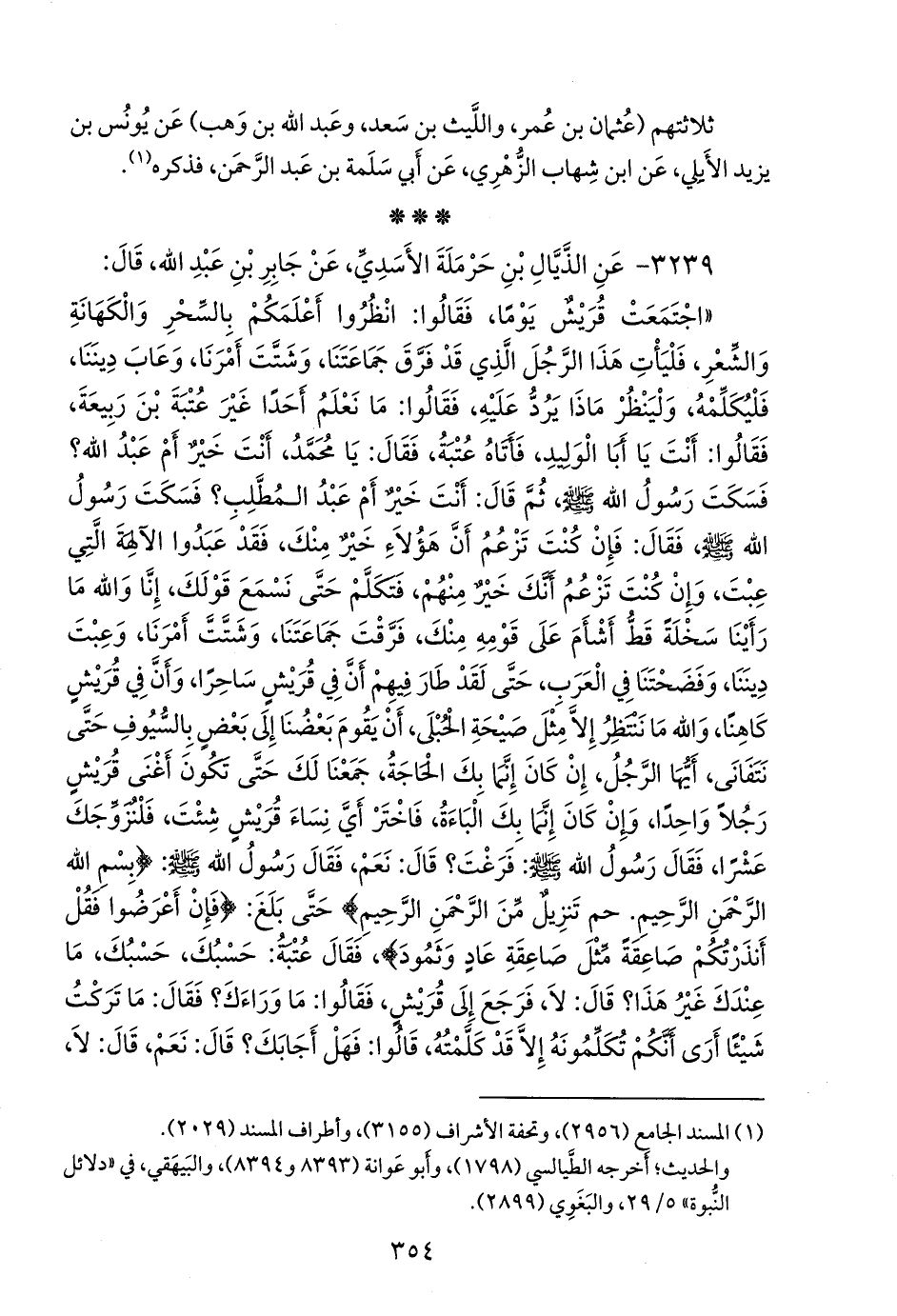 «اجتمعت قريش يوما، فقالوا: انظروا أعلمكم بالسحر والكهانة والشعر، فليأت هذا الرجل الذي قد فرق جماعتنا، وشتت أمرنا، وعاب ديننا، فليكلمه، ولينظر ماذا يرد عليه، فقالوا: ما نعلم أحدا غير عتبة بن ربيعة، فقالوا: أنت يا أبا الوليد، فأتاه عتبة، فقال: يا محمد، أنت خير أم عبد الله؟ فسكت رسول الله صَلى الله عَليه وسَلم ثم قال: أنت خير أم عبد المطلب؟ فسكت رسول الله صَلى الله عَليه وسَلم فقال: فإن كنت تزعم أن هؤلاء خير منك، فقد عبدوا الآلهة التي عبت، وإن كنت تزعم أنك خير منهم، فتكلم حتى نسمع قولك، إنا والله ما رأينا سخلة قط أشأم على قومه منك، فرقت جماعتنا، وشتت أمرنا، وعبت ديننا، وفضحتنا في العرب، حتى لقد طار فيهم أن في قريش ساحرا، وأن في قريش كاهنا، والله ما ننتظر إلا مثل صيحة الحبلى، أن يقوم بعضنا إلى بعض بالسيوف حتى نتفانى، أيها الرجل، إن كان إنما بك الحاجة، جمعنا لك حتى تكون أغنى قريش رجلا واحدا، وإن كان إنما بك الباءة، فاختر أي نساء قريش شئت، فلنزوجك عشرا، فقال رسول الله صَلى الله عَليه وسَلم: فرغت؟ قال: نعم، فقال رسول الله صَلى الله عَليه وسَلم: {بسم الله الرَّحمَن الرحيم. حم. تنزيل من الرَّحمَن الرحيم} حتى بلغ: {فإن أعرضوا فقل أنذرتكم صاعقة مثل صاعقة عاد وثمود}، فقال عتبة: حسبك، حسبك، ما عندك غير هذا؟ قال: لا، فرجع إلى قريش، فقالوا: ما وراءك؟ فقال: ما تركت شيئًا أرى أنكم تكلمونه إلا قد كلمته، قالوا: فهل أجابك؟ قال: نعم، قال: لا،