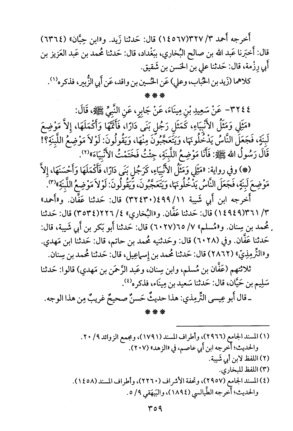 - وفي رواية: «مثلي ومثل الأنبياء، كرجل بنى دارا، فأكملها وأحسنها، إلا موضع لبنة، فجعل الناس يدخلونها، ويتعجبون، ويقولون: لولا موضع اللبنة» (¬٢).