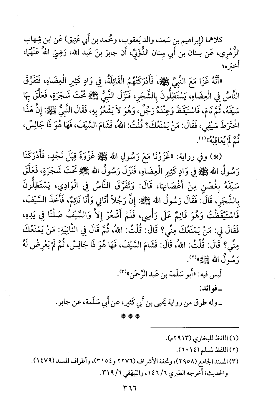 - وفي رواية: «غزونا مع رسول الله صَلى الله عَليه وسَلم غزوة قبل نجد، فأدركنا رسول الله صَلى الله عَليه وسَلم في واد كثير العضاه، فنزل رسول الله صَلى الله عَليه وسَلم تحت شجرة، فعلق سيفه بغصن من أغصانها، قال: وتفرق الناس في الوادي، يستظلون بالشجر، قال: فقال رسول الله صَلى الله عَليه وسَلم: إن رجلا أتاني وأنا نائم، فأخذ السيف، فاستيقظت وهو قائم على رأسي، فلم أشعر إلا والسيف صلتا في يده، فقال لي: من يمنعك مني؟ قال: قلت: الله، ثم قال في الثانية: من يمنعك مني؟ قال: قلت: الله، قال: فشام السيف، فها هو ذا جالس، ثم لم يعرض له رسول الله صَلى الله عَليه وسَلم» (¬٢).