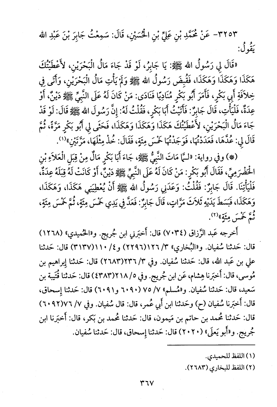 «قال لي رسول الله صَلى الله عَليه وسَلم: يا جابر، لو قد جاء مال البحرين، لأعطيتك هكذا وهكذا وهكذا، فقبض رسول الله صَلى الله عَليه وسَلم ولم يأت مال البحرين، وأتى في خلافة أَبي بكر، فأمر أَبو بكر مناديا فنادى: من كان له على النبي صَلى الله عَليه وسَلم دين، أو عدة، فليأت، قال جابر: فأتيت أبا بكر، فقلت له: إن رسول الله صَلى الله عَليه وسَلم قال: لو قد جاء مال البحرين، لأعطيتك هكذا وهكذا وهكذا، فحثى لي أَبو بكر مرة، ثم قال لي: عدها، فعددتها، فوجدتها خمس مئة، فقال: خذ مثلها، مرتين» (¬١).