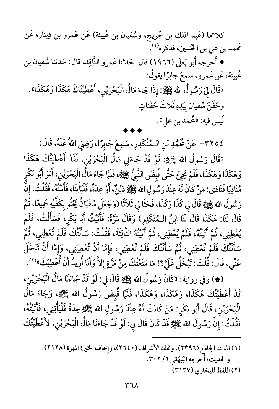 «قال رسول الله صَلى الله عَليه وسَلم: لو قد جاءني مال البحرين، لقد أعطيتك هكذا وهكذا وهكذا، فلم يجئ حتى قبض النبي صَلى الله عَليه وسَلم فلما جاء مال البحرين، أمر أَبو بكر مناديا فنادى: من كان له عند رسول الله صَلى الله عَليه وسَلم دين، أو عدة، فليأتنا، فأتيته، فقلت: إن رسول الله صَلى الله عَليه وسَلم قال لي كذا وكذا، فحثا لي ثلاثا (وجعل سفيان يحثو بكفيه جميعا، ثم قال لنا: هكذا قال لنا ابن المُنكدِر) وقال مرة: فأتيت أبا بكر، فسألت، فلم يعطني، ثم أتيته، فلم يعطني، ثم أتيته الثالثة، فقلت: سألتك فلم تعطني، ثم سألتك فلم تعطني، ثم سألتك فلم تعطني، فإما أن تعطيني، وإما أن تبخل عني، قال: قلت: تبخل علي؟! ما منعتك من مرة إلا وأنا أريد أن أعطيك» (¬١).