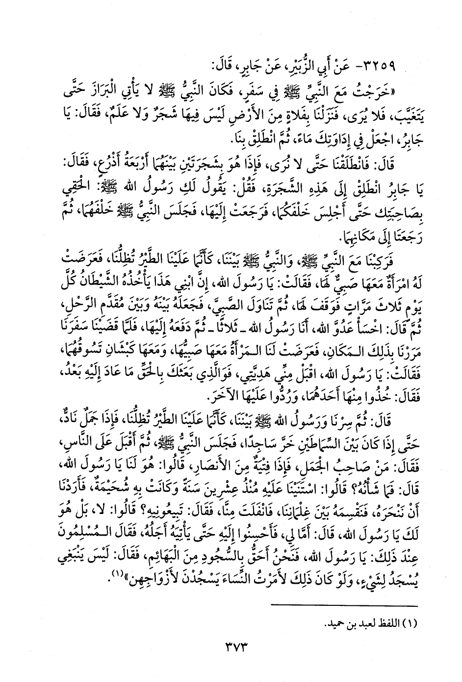 قال: ثم سرنا ورسول الله صَلى الله عَليه وسَلم بيننا، كأنما علينا الطير تظلنا، فإذا جمل ناد، حتى إذا كان بين السماطين خر ساجدا، فجلس النبي صَلى الله عَليه وسَلم ثم أقبل على الناس، فقال: من صاحب الجمل، فإذا فتية من الأنصار، قالوا: هو لنا يا رسول الله، قال: فما شأنه؟ قالوا: استنينا عليه منذ عشرين سنة وكانت به شحيمة، فأردنا أن ننحره، فنقسمه بين غِلماننا، فانفلت منا، فقال: تبيعونيه؟ قالوا: لا، بل هو لك يا رسول الله، قال: أما لي، فأحسنوا إليه حتى يأتيه أجله، فقال المسلمون عند ذلك: يا رسول الله، فنحن أحق بالسجود من البهائم، فقال: ليس ينبغي يسجد لشيء، ولو كان ذلك لأمرت النساء يسجدن لأزواجهن» (¬١).