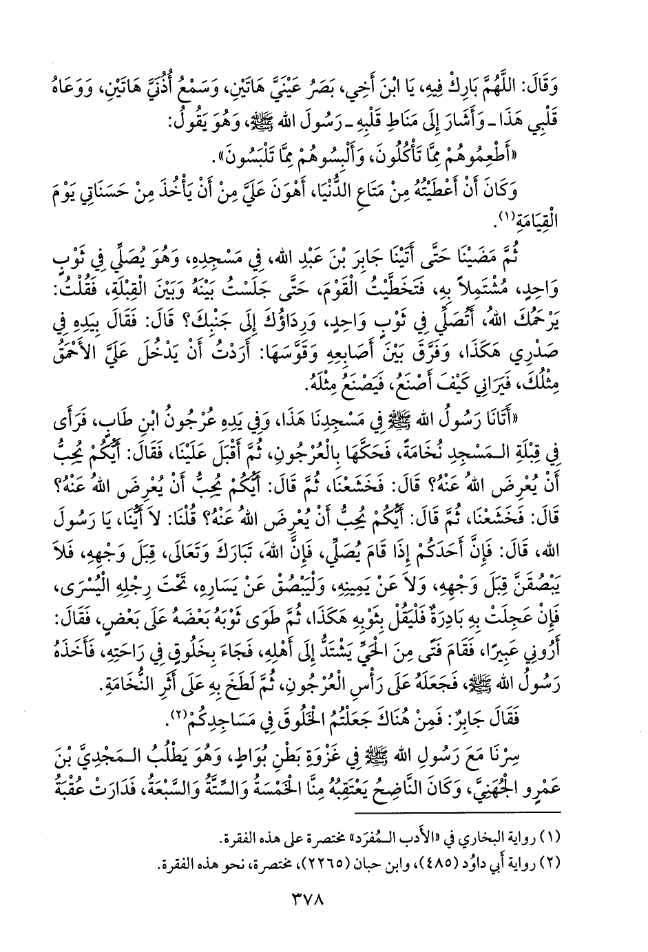 ثم مضينا حتى أتينا جابر بن عبد الله، في مسجده، وهو يصلي في ثوب واحد، مشتملا به، فتخطيت القوم، حتى جلست بينه وبين القبلة، فقلت: يرحمك الله، أتصلي في ثوب واحد، ورداؤك إلى جنبك؟ قال: فقال بيده في صدري هكذا، وفرق بين أصابعه وقوسها: أردت أن يدخل علي الأحمق مثلك، فيراني كيف أصنع، فيصنع مثله.