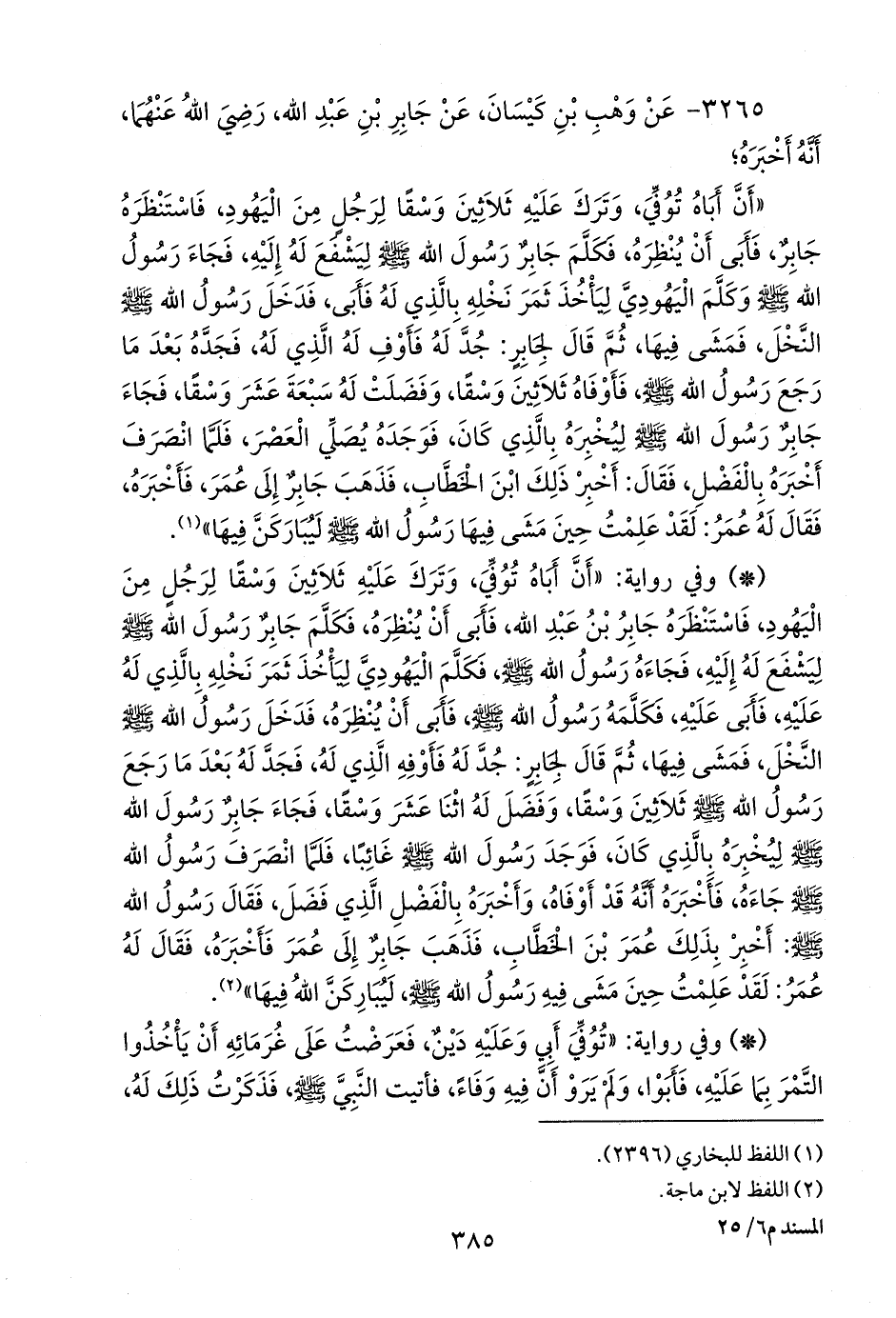 - وفي رواية: «أن أباه توفي، وترك عليه ثلاثين وسقا لرجل من اليهود، فاستنظره جابر بن عبد الله، فأبى أن ينظره، فكلم جابر رسول الله صَلى الله عَليه وسَلم ليشفع له إليه، فجاءه رسول الله صَلى الله عَليه وسَلم فكلم اليهودي ليأخذ ثمر نخله بالذي له عليه، فأبى عليه، فكلمه رسول الله صَلى الله عَليه وسَلم فأبى أن ينظره، فدخل رسول الله صَلى الله عَليه وسَلم النخل، فمشى فيها، ثم قال لجابر: جد له فأوفه الذي له، فجد له بعد ما رجع رسول الله صَلى الله عَليه وسَلم ثلاثين وسقا، وفضل له اثنا عشر وسقا، فجاء جابر رسول الله صَلى الله عَليه وسَلم ليخبره بالذي كان، فوجد رسول الله صَلى الله عَليه وسَلم غائبا، فلما انصرف رسول الله صَلى الله عَليه وسَلم جاءه، فأخبره أنه قد أوفاه، وأخبره بالفضل الذي فضل، فقال رسول الله صَلى الله عَليه وسَلم: أخبر بذلك عمر بن الخطاب، فذهب جابر إلى عمر فأخبره، فقال له عمر: لقد علمت حين مشى فيه رسول الله صَلى الله عَليه وسَلم ليباركن الله فيها» (¬٢).
