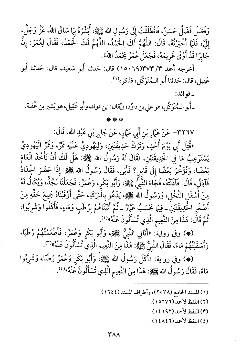 «قتل أبي يوم أحد، وترك حديقتين، وليهودي عليه تمر، وتمر اليهودي يستوعب ما في الحديقتين، فقال له رسول الله صَلى الله عَليه وسَلم: هل لك أن تأخذ العام بعضا، وتؤخر بعضا إلى قابل؟ فأبى، فقال رسول الله صَلى الله عَليه وسَلم: إذا حضر الجداد فآذني، قال: فآذنته، فجاء النبي صَلى الله عَليه وسَلم وأَبو بكر، وعمر، فجعلنا نجد، ويكال له من أسفل النخل، ورسول الله صَلى الله عَليه وسَلم يدعو بالبركة، حتى أوفيناه جميع حقه من أصغر الحديقتين ـ فيما يحسب عمار ـ ثم أتيناهم برطب وماء، فأكلوا وشربوا، ثم قال: هذا من النعيم الذي تسألون عنه» (¬١).