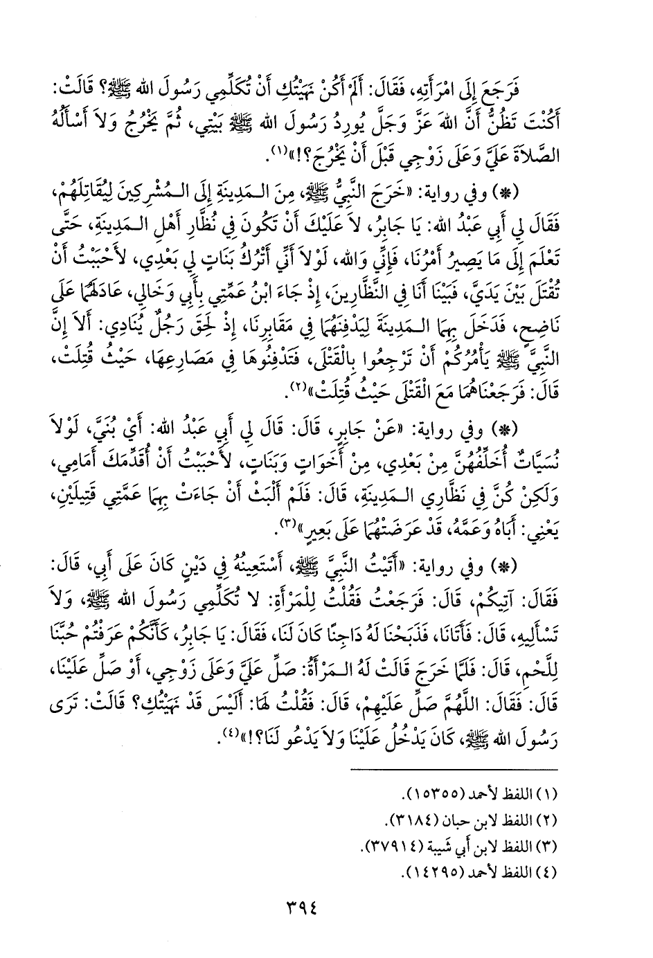 - وفي رواية: «خرج النبي صَلى الله عَليه وسَلم من المدينة إلى المشركين ليقاتلهم، فقال لي أبي عبد الله: يا جابر، لا عليك أن تكون في نظار أهل المدينة، حتى تعلم إلى ما يصير أمرنا، فإني والله، لولا أني أترك بنات لي بعدي، لأحببت أن تقتل بين يدي، فبينا أنا في النظارين، إذ جاء ابن عمتي بأبي وخالي، عادلهما على ناضح، فدخل بهما المدينة ليدفنهما في مقابرنا، إذ لحق رجل ينادي: ألا إن النبي صَلى الله عَليه وسَلم يأمركم أن ترجعوا بالقتلى، فتدفنوها في مصارعها، حيث قتلت، قال: فرجعناهما مع القتلى حيث قتلت» (¬٢).
