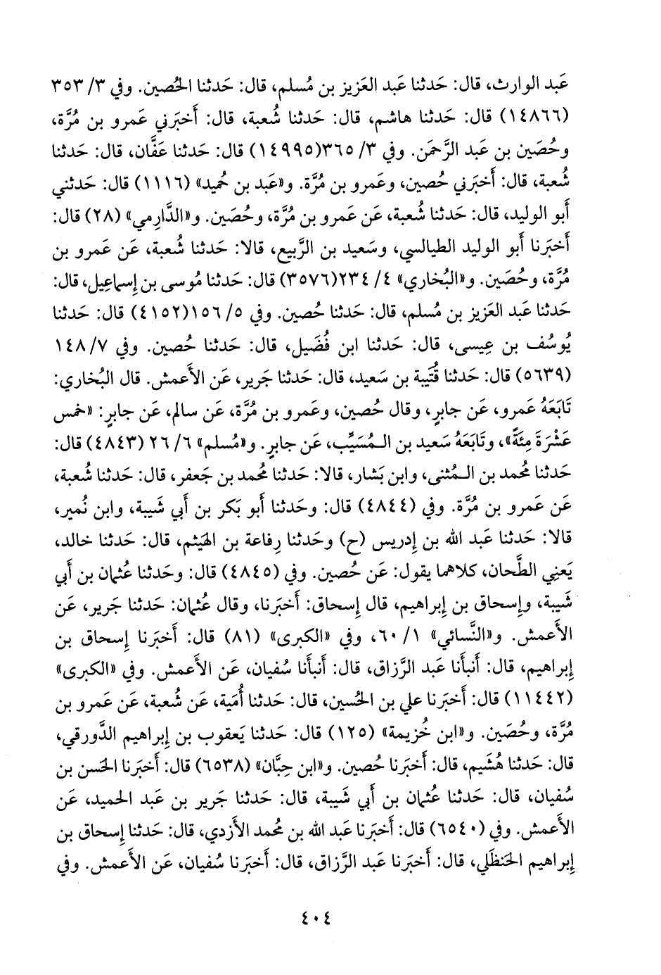 و «البخاري» ٤/ ١٩٣ (٣٥٧٦) قال: حدثنا موسى بن إسماعيل، قال: حدثنا عبد العزيز بن مسلم، قال: حدثنا حصين. وفي ٥/ ١٢٢ (٤١٥٢) قال: حدثنا يوسف بن عيسى، قال: حدثنا ابن فضيل، قال: حدثنا حصين. وفي ٧/ ١١٤ (٥٦٣٩) قال: حدثنا قتيبة بن سعيد، قال: حدثنا جرير، عن الأعمش. قال البخاري: تابعه عَمرو، عن جابر، وقال حصين، وعَمرو بن مُرَّة، عن سالم، عن جابر: «خمس عشرة مئة»، وتابعه سعيد بن المُسَيب، عن جابر. و «مسلم» ٦/ ٢٦ (٤٨٤٣) قال: حدثنا محمد بن المثنى، وابن بشار، قالا: حدثنا محمد بن جعفر، قال: حدثنا شعبة، عن عَمرو بن مُرَّة. وفي (٤٨٤٤) قال: وحدثنا أَبو بكر بن أبي شيبة، وابن نُمير، قالا: حدثنا عبد الله بن إدريس (ح) وحدثنا رفاعة بن الهيثم، قال: حدثنا خالد، يعني الطحان، كلاهما يقول: عن حصين. وفي (٤٨٤٥) قال: وحدثنا عثمان بن أبي شيبة، وإسحاق بن إبراهيم، قال إسحاق: أخبرنا، وقال عثمان: حدثنا جرير، عن الأعمش. و «النَّسَائي» ١/ ٦٠، وفي «الكبرى» (٨١) قال: أخبرنا إسحاق بن إبراهيم، قال: أنبأنا عبد الرزاق، قال: أنبأنا سفيان، عن الأعمش. وفي «الكبرى» (١١٤٤٢) قال: أخبرنا علي بن الحسين، قال: حدثنا أمية، عن شعبة، عن عَمرو بن مُرَّة، وحصين. و «ابن خزيمة» (١٢٥) قال: حدثنا يعقوب بن إبراهيم الدورقي، قال: حدثنا هُشيم، قال: أخبرنا حصين. و «ابن حِبَّان» (٦٥٣٨) قال: أخبرنا الحسن بن سفيان، قال: حدثنا عثمان بن أبي شيبة، قال: حدثنا جَرير بن عبد الحميد، عن الأعمش. وفي (٦٥٤٠) قال: أخبرنا عبد الله بن محمد الأزدي، قال: حدثنا إسحاق بن إبراهيم الحنظلي، قال: أخبرنا عبد الرزاق، قال: أخبرنا سفيان، عن الأعمش. وفي