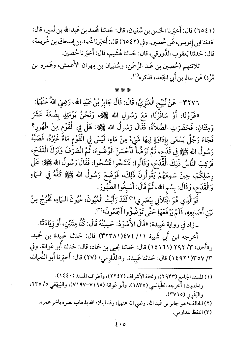 «غزونا، أو سافرنا، مع رسول الله صَلى الله عَليه وسَلم ونحن يومئذ بِضعة عشر ومئتان، فحضرت الصلاة، فقال رسول الله صَلى الله عَليه وسَلم: هل في القوم من طهور؟ فجاء رجل يسعى بإداوة فيها شيء من ماء، ليس في القوم ماء غيره، فصبه رسول الله صَلى الله عَليه وسَلم في قدح، ثم توضأ فأحسن الوضوء، ثم انصرف وترك القدح، فركب الناس ذلك القدح، وقالوا: تمسحوا تمسحوا، فقال رسول الله صَلى الله عَليه وسَلم: على رسلكم، حين سمعهم يقولون ذلك، فوضع رسول الله صَلى الله عَليه وسَلم كفه في الماء والقدح، وقال: بسم الله، ثم قال: أسبغوا الطهور.