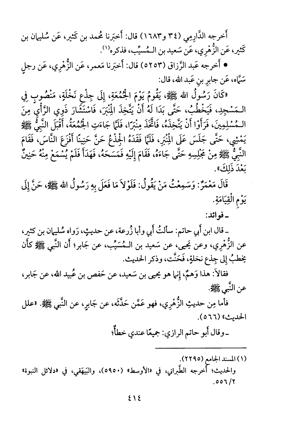 - قلنا: إِسناده ضعيفٌ؛ قال ابن أبي حاتم: سألت أبي وأَبا زُرعَة، عن حديث، رواه سليمان بن كثير، عن الزُّهْري، وعن يحيى، عن سعيد بن المُسَيب، عن جابر؛ أن النبي صَلى الله عَليه وسَلم كأن يخطب إلى جذع نخلة، فحنت، وذكر الحديث.