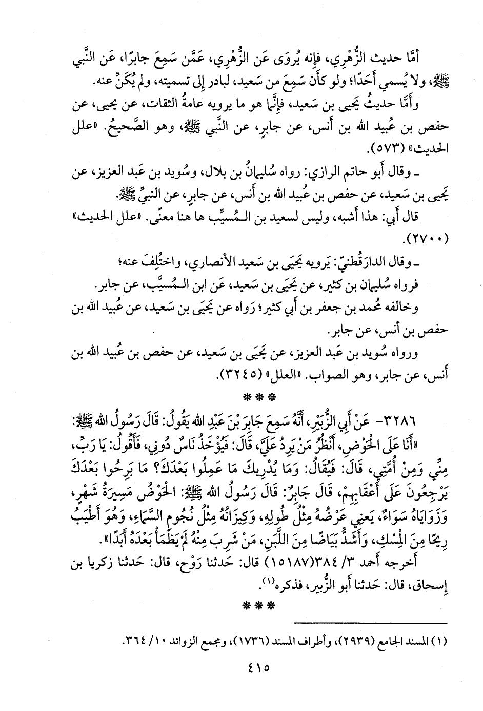«أنا على الحوض، أنظر من يرد علي، قال: فيؤخذ ناس دوني، فأقول: يا رب، مني ومن أمتي، قال: فيقال: وما يدريك ما عملوا بعدك؟ ما برحوا بعدك يرجعون على أعقابهم، قال جابر: قال رسول الله صَلى الله عَليه وسَلم: الحوض مسيرة شهر، وزواياه سواء، يعني عرضه مثل طوله، وكيزانه مثل نجوم السماء، وهو أطيب ريحا من المسك، وأشد بياضا من اللبن، من شرب منه لم يظمأ بعده أبدا».