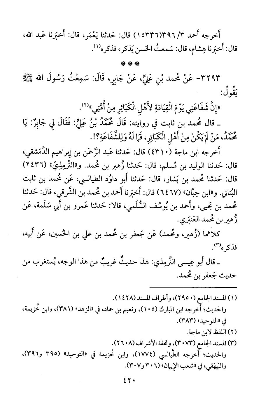 - قال محمد بن ثابت في روايته: قال محمد بن علي: فقال لي جابر: يا محمد، من لم يكن من أهل الكبائر، فما له وللشفاعة؟!.