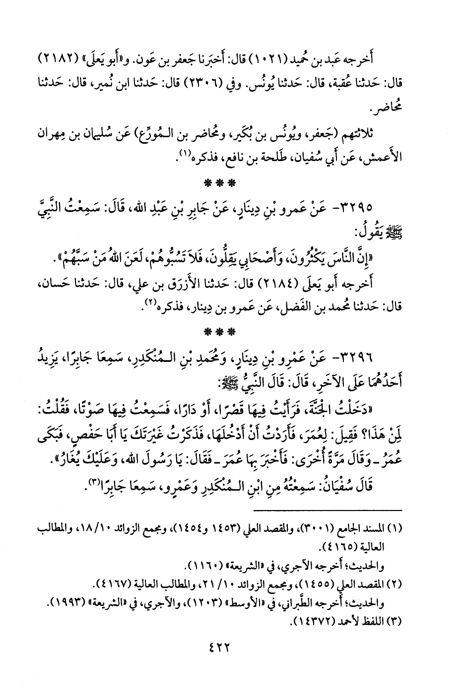 ٣٢٩٦ - عن عَمرو بن دينار، ومحمد بن المُنكدِر، سمعا جابرا، يزيد أحدهما على الآخر، قال: قال النبي صَلى الله عَليه وسَلم: