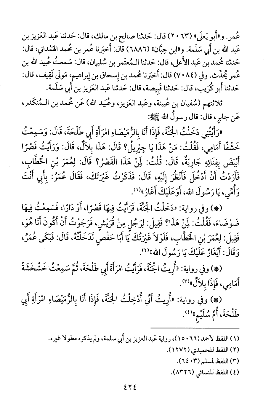 - وفي رواية: «أريت أني أدخلت الجنة، فإذا أنا بالرميصاء امرأة أبي طلحة، أُم سُليم» (¬٤).