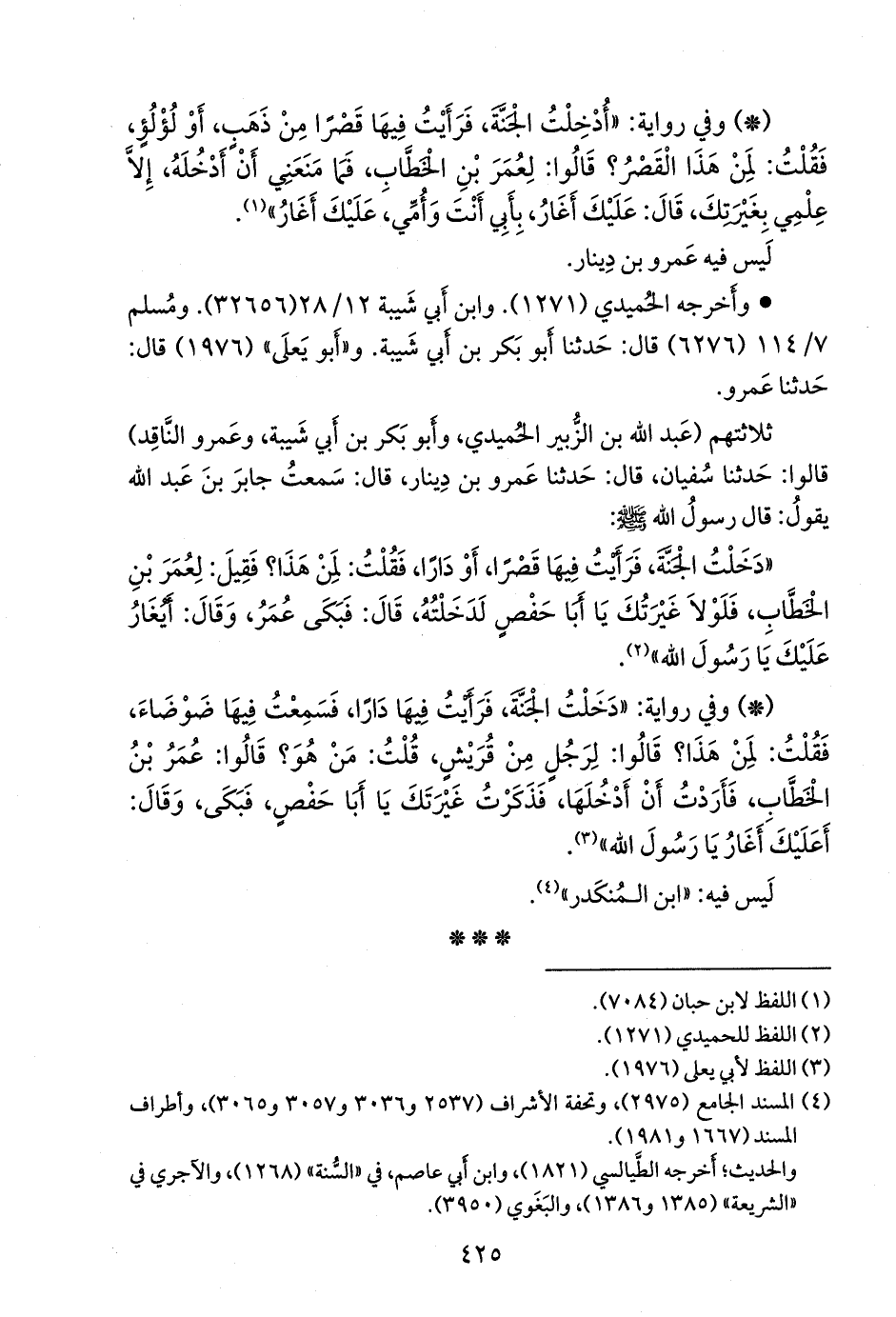 - وفي رواية: «دخلت الجنة، فرأيت فيها دارا، فسمعت فيها ضوضاء، فقلت: لمن هذا؟ قالوا: لرجل من قريش، قلت: من هو؟ قالوا: عمر بن الخطاب، فأردت أن أدخلها، فذكرت غيرتك يا أبا حفص، فبكى، وقال: أعليك أغار يا رسول الله» (¬٣).