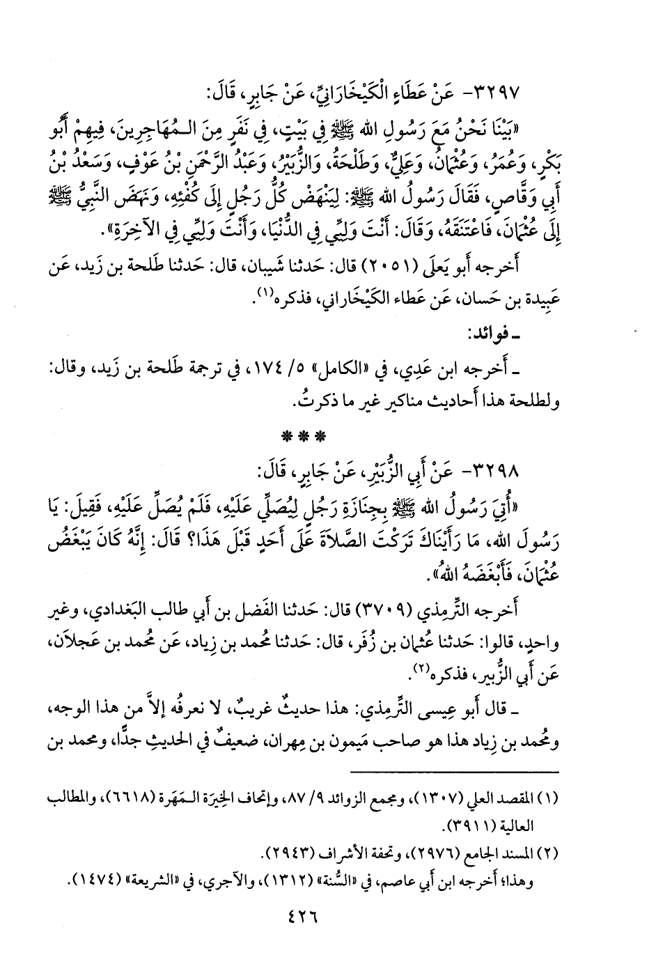 «أتي رسول الله صَلى الله عَليه وسَلم بجِنازة رجل ليصلي عليه، فلم يصل عليه، فقيل: يا رسول الله، ما رأيناك تركت الصلاة على أحد قبل هذا؟ قال: إنه كان يبغض عثمان، فأبغضه الله».
