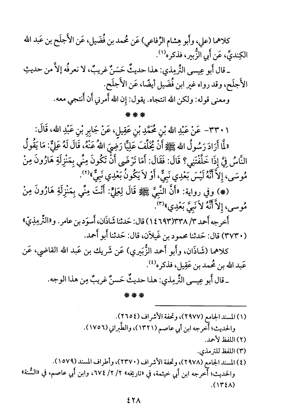 - وفي رواية: «أن النبي صَلى الله عَليه وسَلم قال لعلي: أنت مني بمنزلة هارون من موسى، إلا أنه لا نبي بعدي» (¬٢).