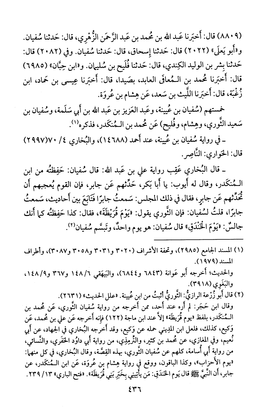 ـ وقال البُخاري عَقِب رواية علي بن عبد الله: قال سفيان: حَفِظتُه من ابن المُنكدِر، وقال له أَيوب: يا أَبا بكر، حَدِّثهم عن جابر، فإِن القوم يُعجبهم أَن تُحَدِّثهم عن جابر، فقال في ذلك المجلس: سمعتُ جابرًا، فَتابَع بين أَحاديث: سمعتُ جابرًا. قلتُ لسفيان: فإِن الثوري يقول: «يوم قُريظة»، فقال: كذا حَفِظتُه كما أَنك جالسٌ: «يوم الخندق» قال سفيان: هو يوم واحدٌ، وتَبسَّم سفيان (¬١).