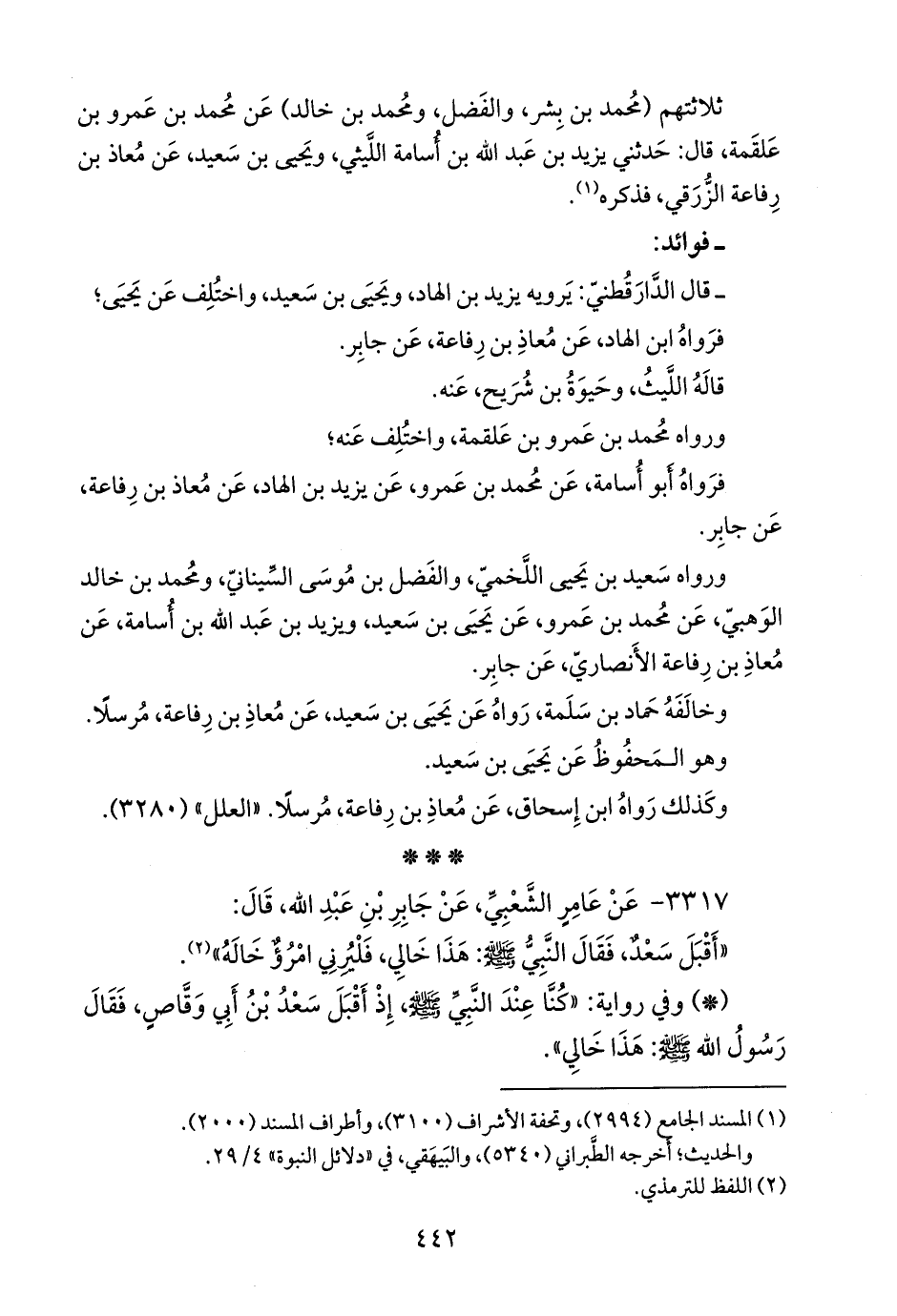 ورواه سعيد بن يحيى اللخمي، والفضل بن موسى السيناني، ومحمد بن خالد الوهبي، عن محمد بن عَمرو، عن يحيى بن سعيد، ويزيد بن عبد الله بن أُسامة، عن معاذ بن رفاعة الأَنصاري، عن جابر.