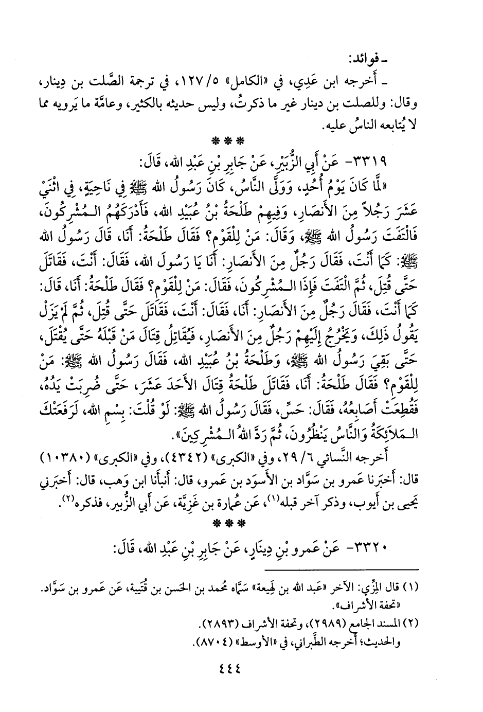 «لما كان يوم أحد، وولى الناس، كان رسول الله صَلى الله عَليه وسَلم في ناحية، في اثني عشر رجلا من الأنصار، وفيهم طلحة بن عُبيد الله، فأدركهم المشركون، فالتفت رسول الله صَلى الله عَليه وسَلم وقال: من للقوم؟ فقال طلحة: أنا، قال رسول الله صَلى الله عَليه وسَلم: كما أنت، فقال رجل من الأنصار: أنا يا رسول الله، فقال: أنت، فقاتل حتى قتل، ثم التفت فإذا المشركون، فقال: من للقوم؟ فقال طلحة: أنا، قال: كما أنت، فقال رجل من الأنصار: أنا، فقال: أنت، فقاتل حتى قتل، ثم لم يزل يقول ذلك، ويخرج إليهم رجل من الأنصار، فيقاتل قتال من قبله حتى يقتل، حتى بقي رسول الله صَلى الله عَليه وسَلم وطلحة بن عُبيد الله، فقال رسول الله صَلى الله عَليه وسَلم: من للقوم؟ فقال طلحة: أنا، فقاتل طلحة قتال الأحد عشر، حتى ضربت يده، فقطعت أصابعه، فقال: حس، فقال رسول الله صَلى الله عَليه وسَلم: لو قلت: بسم الله، لرفعتك الملائكة والناس ينظرون، ثم رد الله المشركين».