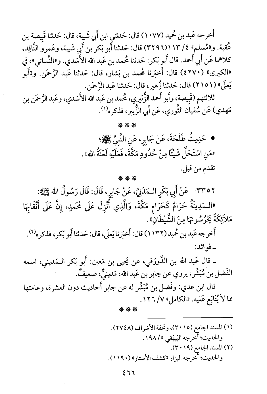 ـ قلنا: إسناده ضعيفٌ؛ قال عبد الله بن الدورقي، عن يَحيى بن مَعين: أَبو بكر المدني، اسمه الفضل بن مُبَشِّر، يَروي عن جابر بن عبد الله، مَدني، ضعيفٌ.