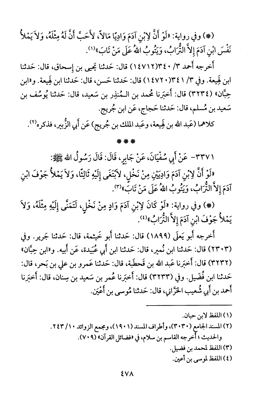 «لو أن لابن آدم واديين من نخل، لابتغى إليه ثالثا، ولا يملأ جوف ابن آدم إلا التراب، ويتوب الله على من تاب» (¬١).