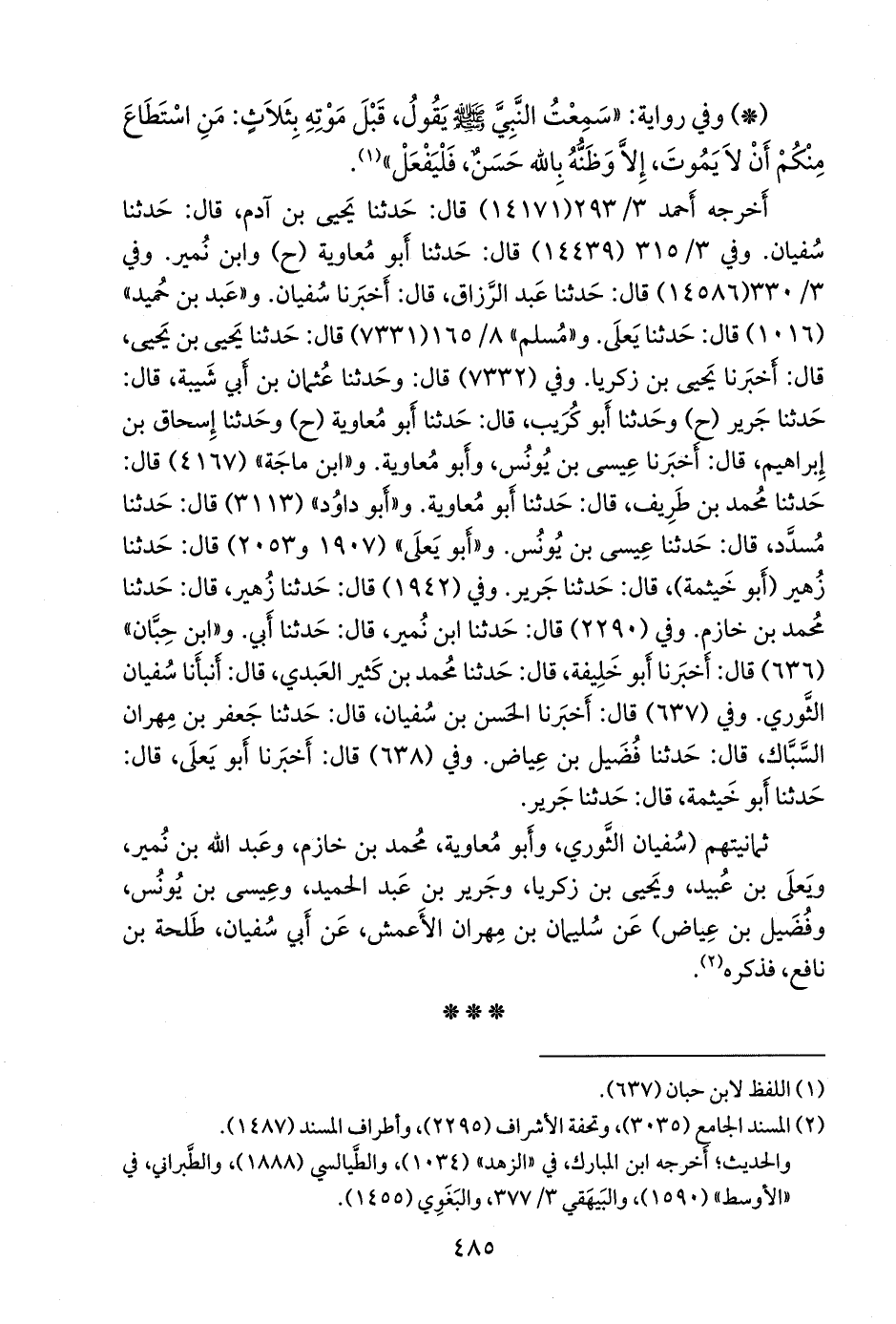 و «ابن ماجة» (٤١٦٧) قال: حدثنا محمد بن طريف، قال: حدثنا أَبو معاوية. و «أَبو داود» (٣١١٣) قال: حدثنا مُسدد، قال: حدثنا عيسى بن يونس. و «أَبو يَعلى» (١٩٠٧ و ٢٠٥٣) قال: حدثنا زهير (أَبو خيثمة)، قال: حدثنا جَرير. وفي (١٩٤٢) قال: حدثنا زهير، قال: حدثنا محمد بن خازم. وفي (٢٢٩٠) قال: حدثنا ابن نُمير، قال: حدثنا أبي. و «ابن حِبَّان» (٦٣٦) قال: أخبرنا أَبو خليفة، قال: حدثنا محمد بن كثير العبدي، قال: أنبأنا سفيان الثوري. وفي (٦٣٧) قال: أخبرنا الحسن بن سفيان، قال: حدثنا جعفر بن مِهران السباك، قال: حدثنا فُضيل بن عِياض. وفي (٦٣٨) قال: أخبرنا أَبو يَعلى، قال: حدثنا أَبو خيثمة، قال: حدثنا جَرير.