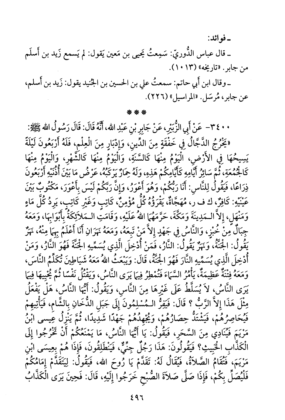 - قلنا: إِسناده ضعيفٌ؛ قال عباس الدوري: سمعت يحيى بن مَعين يقول: لم يسمع زيد بن أسلم من جابر. «تاريخه» (١٠١٣).