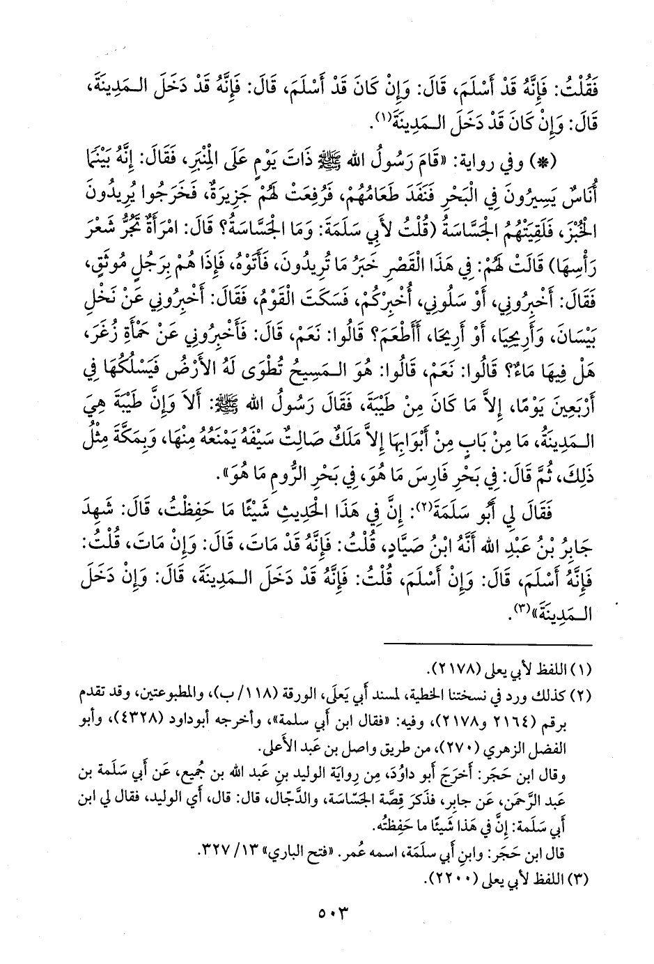 وقال ابن حجر: أخرج أَبو داود، من رواية الوليد بن عبد الله بن جميع، عن أبي سلمة بن عبد الرَّحمَن، عن جابر، فذكر قصة الجساسة، والدجال، قال: قال، أي الوليد، فقال لي ابن أبي سلمة: إن في هذا شيئًا ما حفظته.