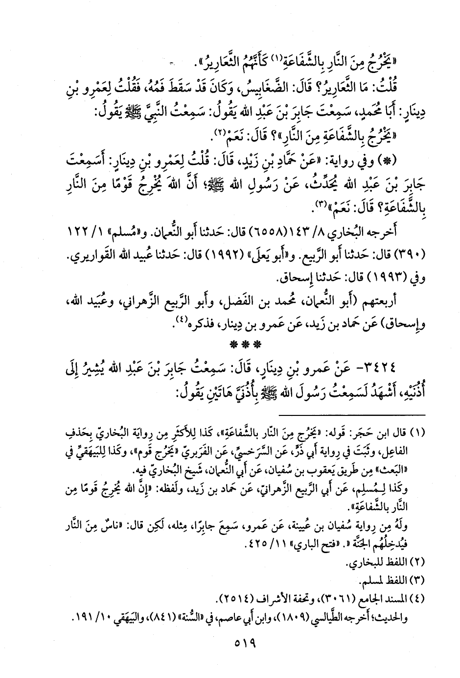- وفي رواية: «عن حماد بن زيد، قال: قلت لعَمرو بن دينار: أسمعت جابر بن عبد الله يحدث، عن رسول الله صَلى الله عَليه وسَلم؛ أن الله يخرج قوما من النار بالشفاعة؟ قال: نعم» (¬١).