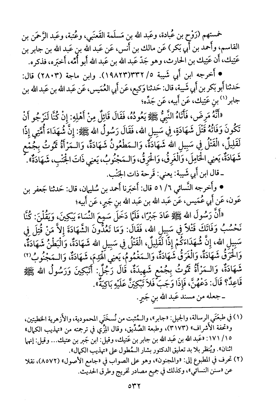 - وأخرجه النَّسَائي ٦/ ٥١ قال: أخبرنا أحمد بن سليمان، قال: حدثنا جعفر بن عون، عن أبي عميس، عن عبد الله بن عبد الله بن جبر، عن أبيه؛