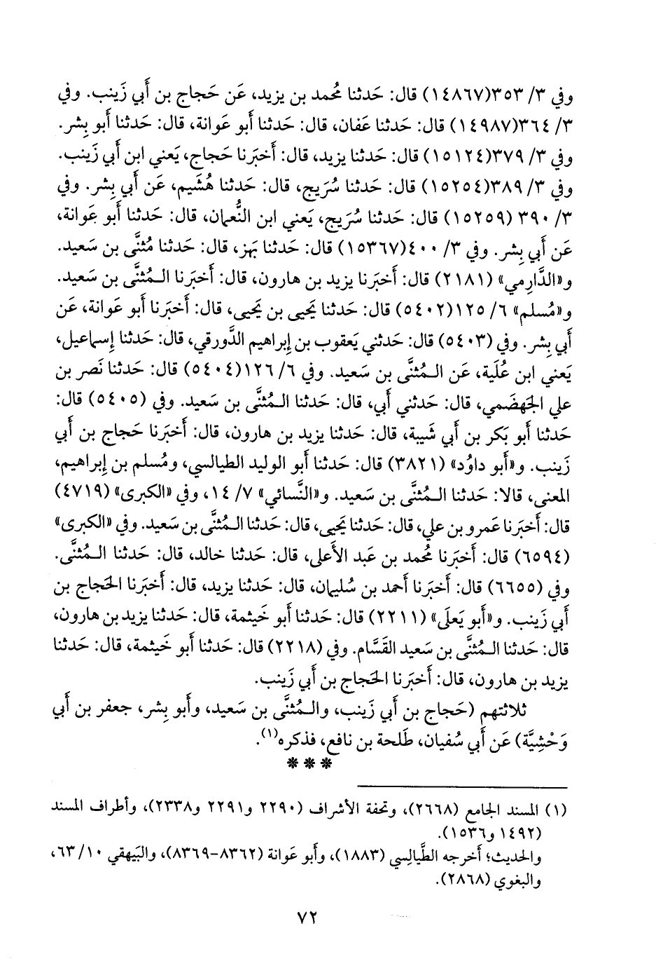 وفي ٣/ ٣٩٠ (١٥٢٥٩) قال: حدثنا سريج، يعني ابن النعمان، قال: حدثنا أَبو عَوانة، عن أبي بشر. وفي ٣/ ٤٠٠ (١٥٣٦٧) قال: حدثنا بَهز، قال: حدثنا مثنى بن سعيد. و «الدَّارِمي» (٢١٨١) قال: أخبرنا يزيد بن هارون، قال: أخبرنا المثنى بن سعيد. و «مسلم» ٦/ ١٢٥ (٥٤٠٢) قال: حدثنا يحيى بن يحيى، قال: أخبرنا أَبو عَوانة، عن أبي بشر. وفي (٥٤٠٣) قال: حدثني يعقوب بن إبراهيم الدورقي، قال: حدثنا إسماعيل، يعني ابن عُلَية، عن المثنى بن سعيد. وفي ٦/ ١٢٦ (٥٤٠٤) قال: حدثنا نصر بن علي الجهضمي، قال: حدثني أبي، قال: حدثنا المثنى بن سعيد. وفي (٥٤٠٥) قال: حدثنا أَبو بكر بن أبي شيبة، قال: حدثنا يزيد بن هارون، قال: أخبرنا حجاج بن أبي زينب. و «أَبو داود» (٣٨٢١) قال: حدثنا أَبو الوليد الطيالسي، ومسلم بن إبراهيم، المَعنَى، قالا: حدثنا المثنى بن سعيد. و «النَّسَائي» ٧/ ١٤، وفي «الكبرى» (٤٧١٩) قال: أخبرنا عَمرو بن علي، قال: حدثنا يحيى، قال: حدثنا المثنى بن سعيد. وفي «الكبرى» (٦٥٩٤) قال: أخبرنا محمد بن عبد الأعلى، قال: حدثنا خالد، قال: حدثنا المثنى. وفي (٦٦٥٥) قال: أخبرنا أحمد بن سليمان، قال: حدثنا يزيد، قال: أخبرنا الحجاج بن أبي زينب. و «أَبو يَعلى» (٢٢١١) قال: حدثنا أَبو خيثمة، قال: حدثنا يزيد بن هارون، قال: حدثنا المثنى بن سعيد القسام. وفي (٢٢١٨) قال: حدثنا أَبو خيثمة، قال: حدثنا يزيد بن هارون، قال: أخبرنا الحجاج بن أبي زينب.