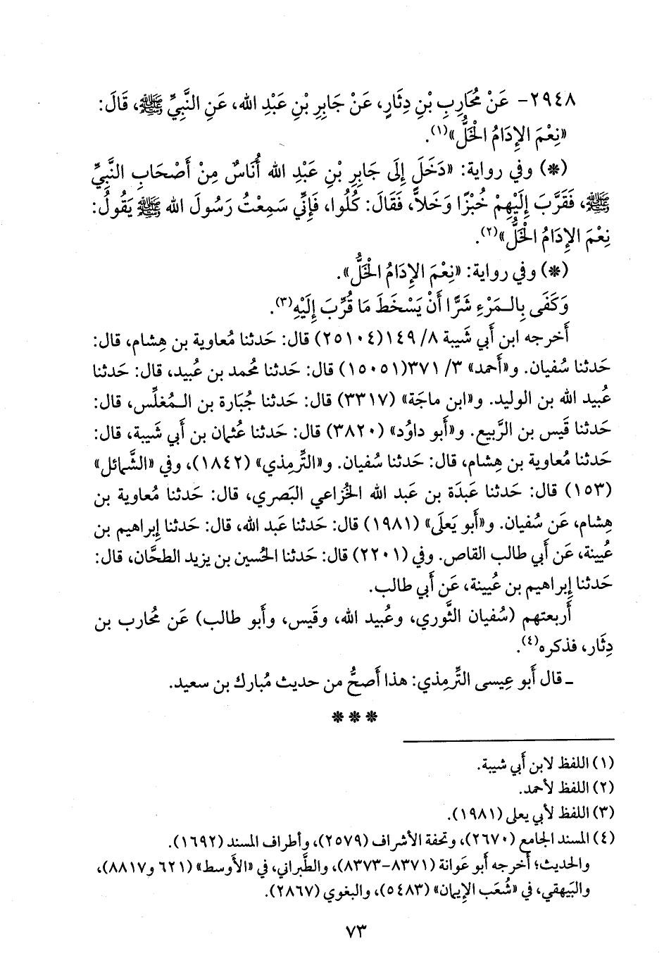- وفي رواية: «دخل إلى جابر بن عبد الله أناس من أصحاب النبي صَلى الله عَليه وسَلم فقرب إليهم خبزا وخلا، فقال: كلوا، فإني سمعت رسول الله صَلى الله عَليه وسَلم يقول: نعم الإدام الخل» (¬٢).