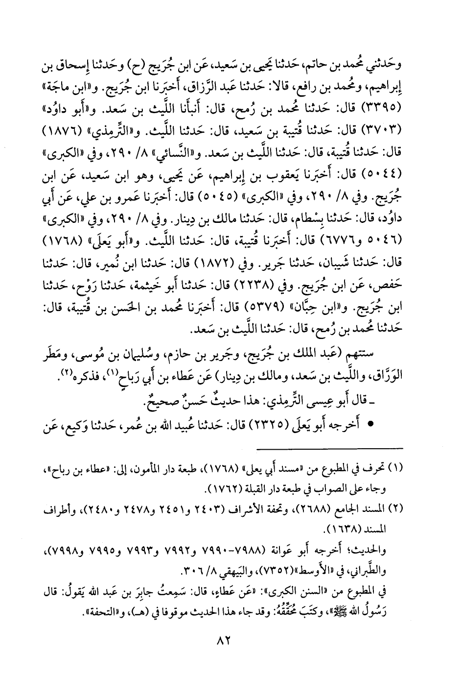 (¬٣) في نسخة مراد ملا، والمطبوع من «السنن الكبرى»: «عن عطاء، قال: سمعت جابر بن عبد الله يقول: قال رسول الله صَلى الله عَليه وسَلم»، وأشار محققه إلى أن هذا الحديث ورد مَوقوفًا في نسخة المكتبة الظاهرية الخطية، و «التحفة».