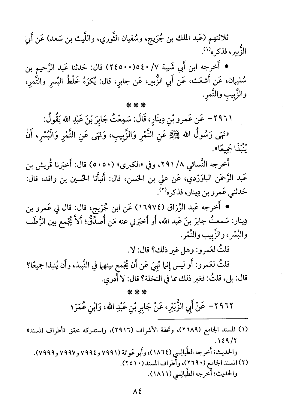 - أخرجه عبد الرزاق (١٦٩٧٤) عن ابن جُريج، قال: قال لي عَمرو بن دينار: سمعت جابر بن عبد الله، أو أخبرني عنه من أصدق؛ ألا يجمع بين الرطب والبُسْر، والزبيب والتمر.