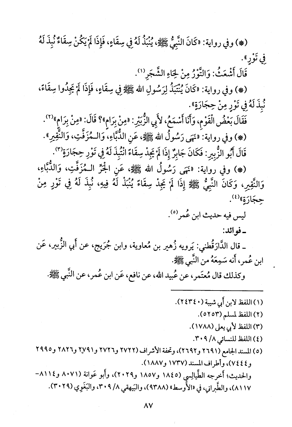 - وقال الدارقُطني: أخرج مسلم من حديث أبي الزبير، عن ابن عمر، سمع النبي صَلى الله عَليه وسَلم ينهى عن نبيذ الجر، والدُّبَّاء، والمزفت.