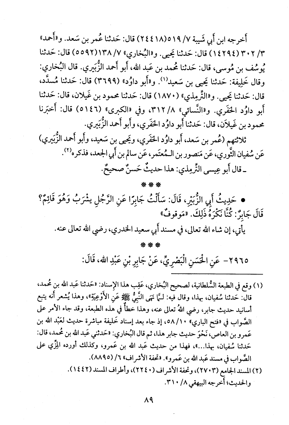 قال البخاري: وقال خليفة: حدثنا يحيى بن سعيد (¬١). و «أَبو داود» (٣٦٩٩) قال: حدثنا مُسدد، قال: حدثنا يحيى. و «التِّرمِذي» (١٨٧٠) قال: حدثنا محمود بن غَيلان، قال: حدثنا أَبو داود الحَفَري. و «النَّسَائي» ٨/ ٣١٢، وفي «الكبرى» (٥١٤٦) قال: أخبرنا محمود بن غَيلان، قال: حدثنا أَبو داود الحَفَري، وأَبو أحمد الزُّبَيري.