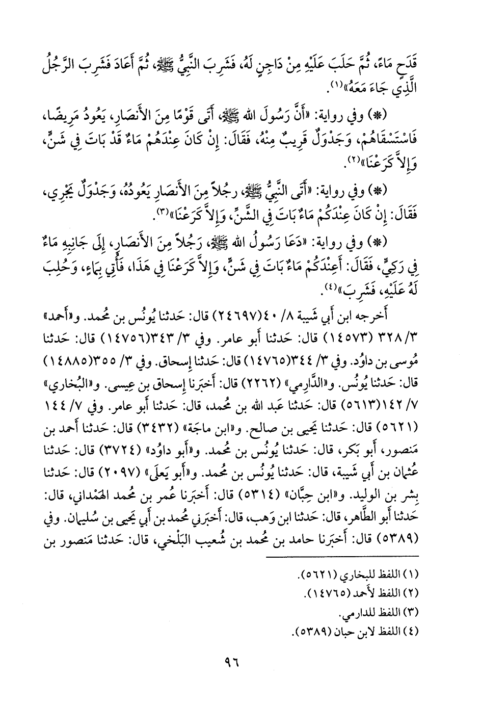 - وفي رواية: «دعا رسول الله صَلى الله عَليه وسَلم رجلا من الأنصار، إلى جانبه ماء في ركي، فقال: أعندكم ماء بات في شن، وإلا كرعنا في هذا، فأتي بماء، وحلب له عليه، فشرب» (¬١).