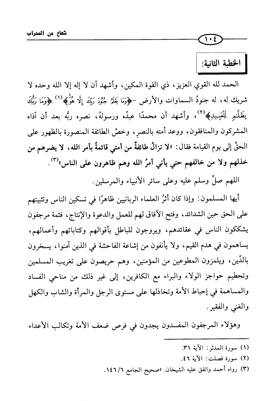 الحمد لله القوي العزيز، ذي القوة المكين، وأشهد أن لا إله إلا الله وحده لا شريك له، له جنودُ السماوات والأرض - {وَمَا يَعْلَمُ جُنُودَ رَبِّكَ إِلاَّ هُوَ} (¬1) {وَمَا رَبُّكَ بِظَلاَّمٍ لِّلْعَبِيدِ} (¬2)، وأشهد أن محمدًا عبدُه ورسولهُ، نصره ربُّه بعد أن آذاه المشركون والمنافقون، ووعد أمته بالنصرِ، وخصَّ الطائفة المنصورة بالظهور على الحقِّ إلى يوم القيامة فقال: «لا تزالُ طائفةٌ من أمتي قائمةً بأمر الله، لا يضرهم من خذلهم ولا من خالفهم حتي يأتي أمرُ الله وهم ظاهرون على الناس» (¬3).