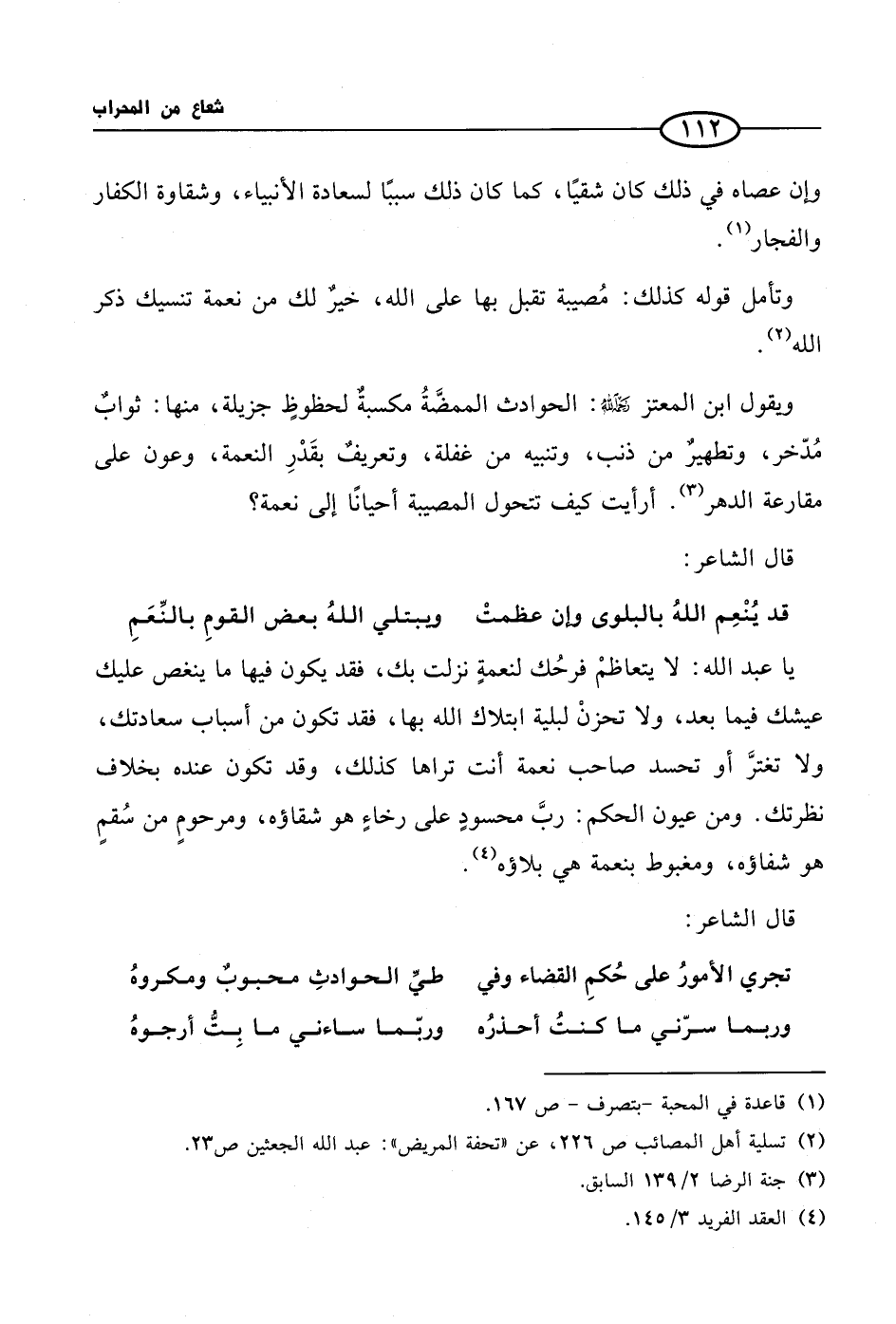 ويقول ابن المعتز رحمه الله: الحوادث الممضَّةُ مكسبةٌ لحظوظٍ جزيلة، منها: ثوابٌ مُدّخر، وتطهيرٌ من ذنب، وتنبيه من غفلة، وتعريفٌ بقَدْرِ النعمة، وعون على مقارعة الدهر (¬3). أرأيت كيف تتحول المصيبة أحيانًا إلى نعمة؟