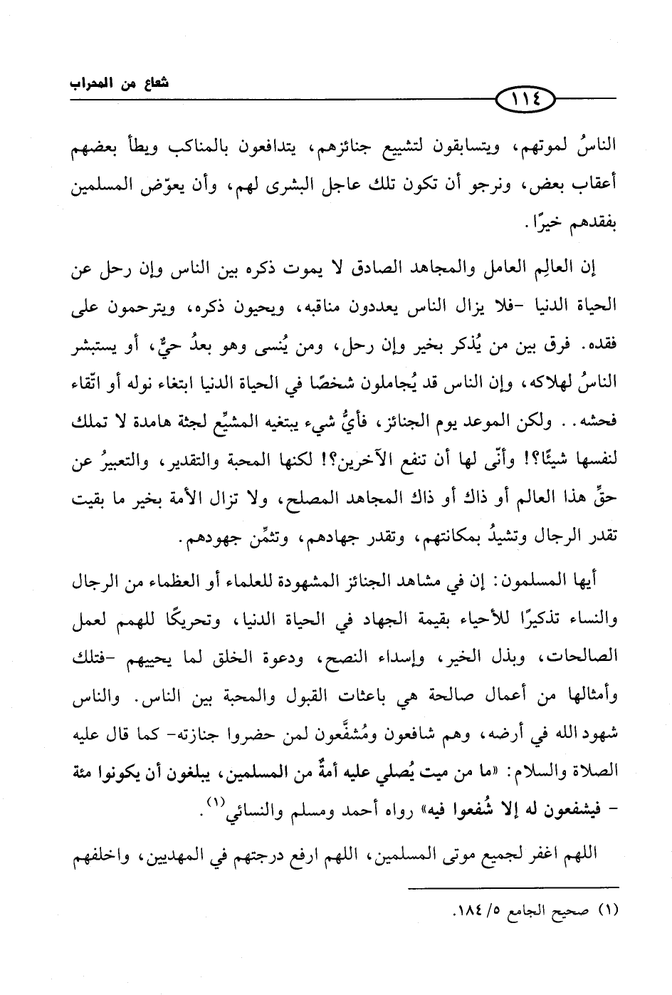 أيها المسلمون: إن في مشاهد الجنائز المشهودة للعلماء أو العظماء من الرجال والنساء تذكيرًا للأحياء بقيمة الجهاد في الحياة الدنيا، وتحريكًا للهمم لعمل الصالحات، وبذل الخير، وإسداء النصح، ودعوة الخلق لما يحييهم -فتلك وأمثالها من أعمال صالحة هي باعثات القبول والمحبة بين الناس. والناس شهود الله في أرضه، وهم شافعون ومُشفَّعون لمن حضروا جنازته -كما قال عليه الصلاة والسلام: «ما من ميت يُصلي عليه أمةٌ من المسلمين، يبلغون أن يكونوا مئة -فيشفعون له إلا شُفعوا فيه» رواه أحمد ومسلم والنسائي (¬1).