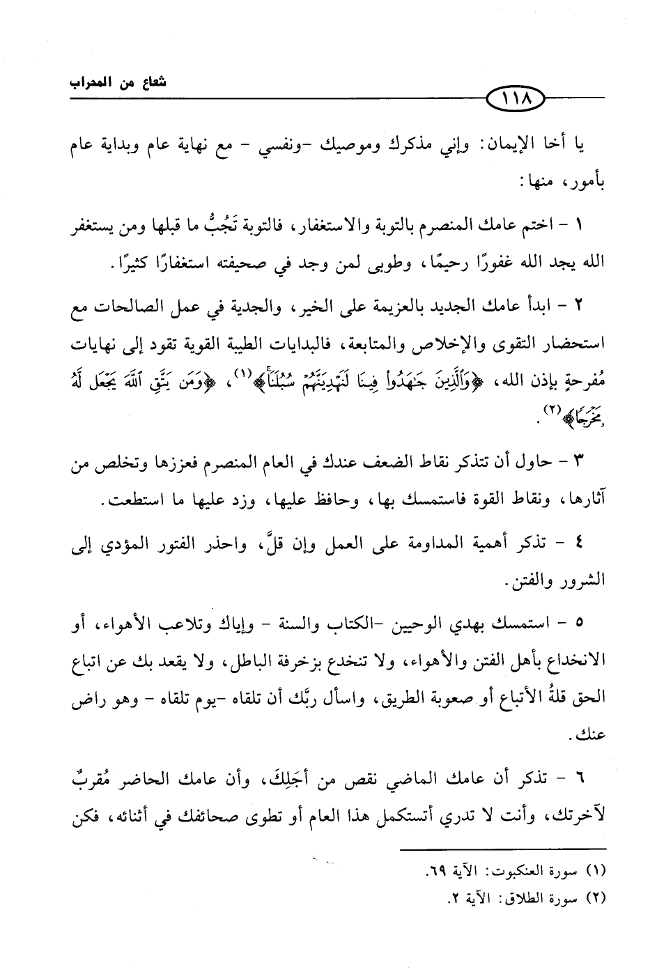 2 - ابدأ عامك الجديد بالعزيمة على الخير، والجدية في عمل الصالحات مع استحضار التقوى والإخلاص والمتابعة، فالبدايات الطيبة القوية تقود إلى نهايات مُفرحةٍ بإذن الله، {وَالَّذِينَ جَاهَدُوا فِينَا لَنَهْدِيَنَّهُمْ سُبُلَنَا} (¬1)، {وَمَن يَتَّقِ اللَّهَ يَجْعَل لَّهُ مَخْرَجًا} (¬2).