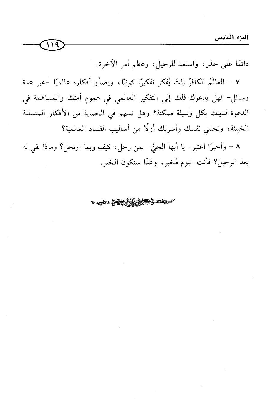 7 - العالَمُ الكافرُ باتَ يُفكر تفكيرًا كونيًا، ويصدِّر أفكاره عالميًا -عبر عدة وسائل - فهل يدعوك ذلك إلى التفكير العالمي في هموم أمتك والمساهمة في الدعوة لدينك بكل وسيلة ممكنة؟ وهل تسهم في الحماية من الأفكار المتسللة الخبيثة، وتحمي نفسك وأسرتك أولًا من أساليب الفساد العالمية؟