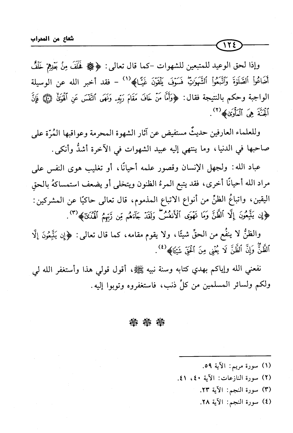 وإذا لحق الوعيد للمتبعين للشهوات -كما قال تعالى: {فَخَلَفَ مِن بَعْدِهِمْ خَلْفٌ أَضَاعُوا الصَّلاةَ وَاتَّبَعُوا الشَّهَوَاتِ فَسَوْفَ يَلْقَوْنَ غَيًّا} (¬1) - فقد أخبر الله عن الوسيلة الواجبة وحكم بالنتيجة فقال: {وَأَمَّا مَنْ خَافَ مَقَامَ رَبِّهِ وَنَهَى النَّفْسَ عَنِ الْهَوَى (40) فَإِنَّ الْجَنَّةَ هِيَ الْمَأْوَى} (¬2).
