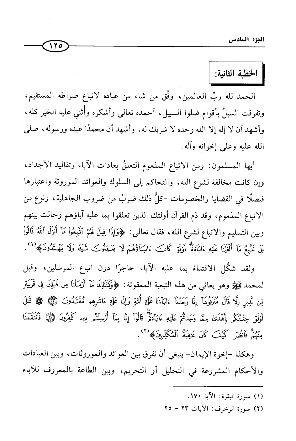 أيها المسلمون: ومن الاتباع المذموم التعلقُ بعادات الآباء وتقاليد الأجداد، وإن كانت مخالفة لشرع الله، والتحاكم إلى السلوك والعوائد الموروثة واعتبارها فيصلًا في القضايا والخصومات -كلُّ ذلك ضربٌ من ضروب الجاهلية، ونوع من الاتباع المذموم، وقد ذم القرآن أولئك الذين تعلقوا بما عليه آباؤهم وحالت بينهم وبين التسليم والاتباع لشرع الله، فقال تعالى: {وَإِذَا قِيلَ لَهُمُ اتَّبِعُوا مَا أَنزَلَ اللَّهُ قَالُوا بَلْ نَتَّبِعُ مَا أَلْفَيْنَا عَلَيْهِ آبَاءَنَا أَوَلَوْ كَانَ آبَاؤُهُمْ لاَ يَعْقِلُونَ شَيْئًا وَلاَ يَهْتَدُونَ} (¬1).