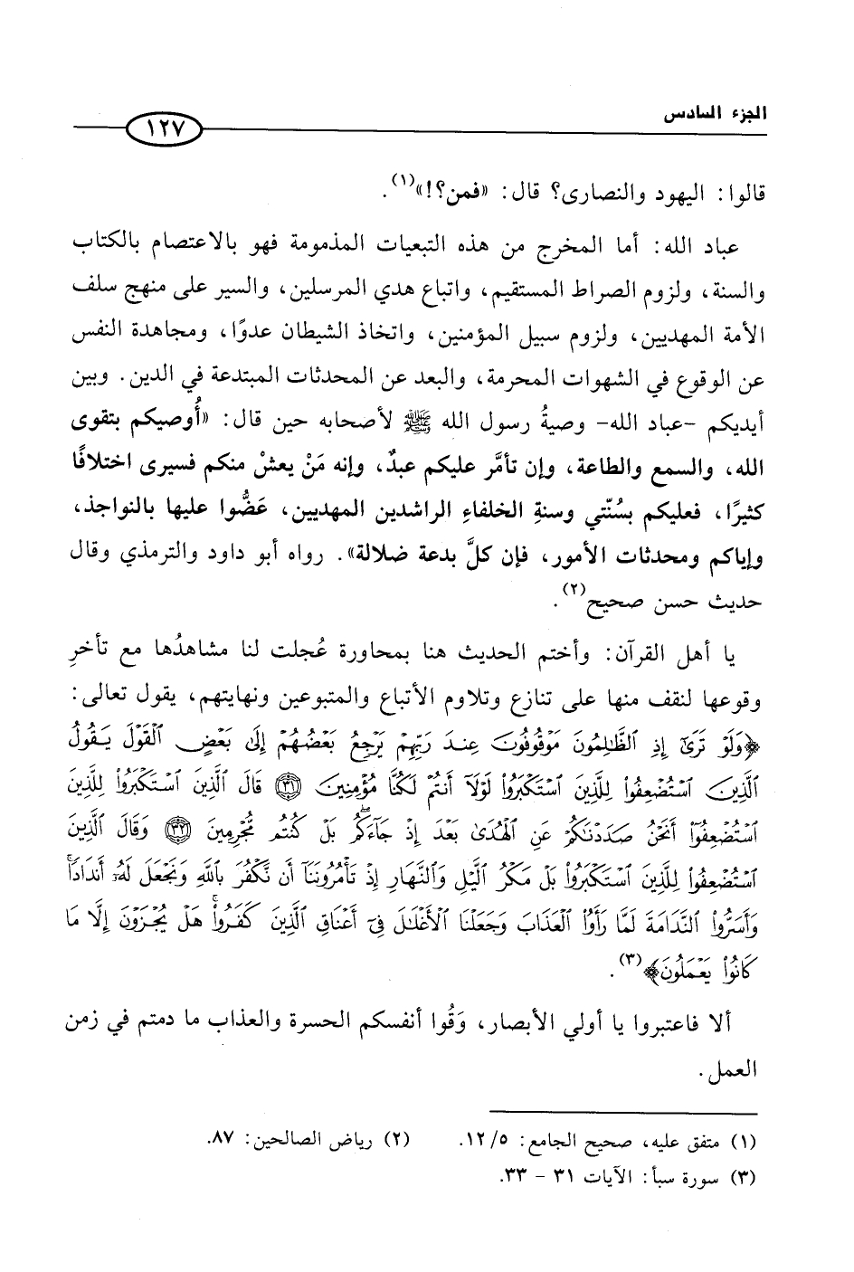 يا أهل القرآن: وأختم الحديث هنا بمحاورة عُجلت لنا مشاهدُها مع تأخرِ وقوعها لنقف منها على تنازع وتلاوم الأتباع والمتبوعين ونهايتهم، يقول تعالى: {وَلَوْ تَرَى إِذِ الظَّالِمُونَ مَوْقُوفُونَ عِندَ رَبِّهِمْ يَرْجِعُ بَعْضُهُمْ إِلَى بَعْضٍ الْقَوْلَ يَقُولُ الَّذِينَ اسْتُضْعِفُوا لِلَّذِينَ اسْتَكْبَرُوا لَوْلا أَنتُمْ لَكُنَّا مُؤْمِنِينَ (31) قَالَ الَّذِينَ اسْتَكْبَرُوا لِلَّذِينَ اسْتُضْعِفُوا أَنَحْنُ صَدَدْنَاكُمْ عَنِ الْهُدَى بَعْدَ إِذْ جَاءكُم بَلْ كُنتُم مُّجْرِمِينَ (32) وَقَالَ الَّذِينَ اسْتُضْعِفُوا لِلَّذِينَ اسْتَكْبَرُوا بَلْ مَكْرُ اللَّيْلِ وَالنَّهَارِ إِذْ تَأْمُرُونَنَا أَن نَّكْفُرَ بِاللَّهِ وَنَجْعَلَ لَهُ أَندَادًا وَأَسَرُّوا النَّدَامَةَ لَمَّا رَأَوُا الْعَذَابَ وَجَعَلْنَا الأَغْلالَ فِي أَعْنَاقِ الَّذِينَ كَفَرُوا هَلْ يُجْزَوْنَ إِلاَّ مَا كَانُوا يَعْمَلُونَ} (¬3).